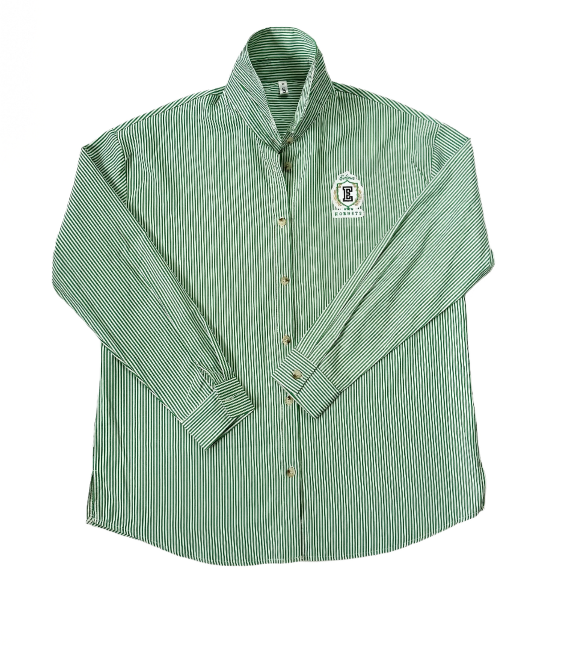 With a custom patch and green stripes, it's the perfect way to feel a little more polished at any school sports event! Slightly oversized fit. Perfect to wear as a half tuck or untucked.